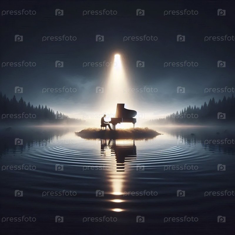 Музыкант играет на фортепиано, которое было размещено на причале, простирающемся в тихое море при закате с появлением первых звезд