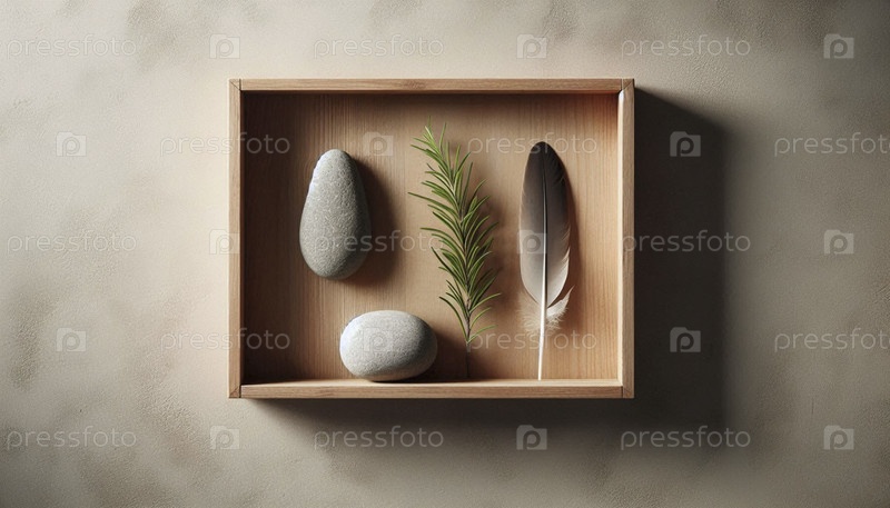 Рустичная полка с камнем, перьями и веточкой розмарина Ai создала изображение