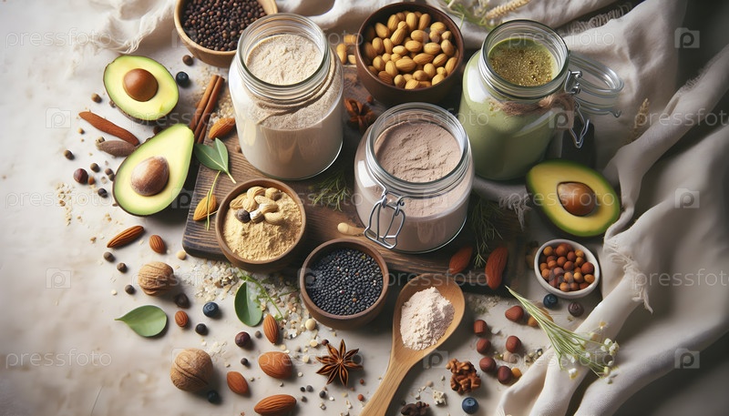 Бохо-стильный плоский слой с веганскими белковыми порошками в стеклянных банках, Ai created image