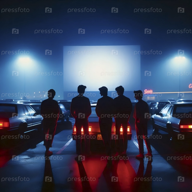 Группа друзей, сидящих на капоте автомобиля и слушающих музыку из бумбокса в драйв-ин-кинотеатре, Ai generated image