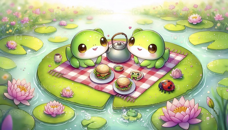 Кавайская сцена пикника на лилии, Ai generated image
