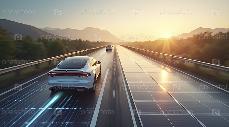 Автомагистраль на солнечной батарее с электромобилями, Ai generated image