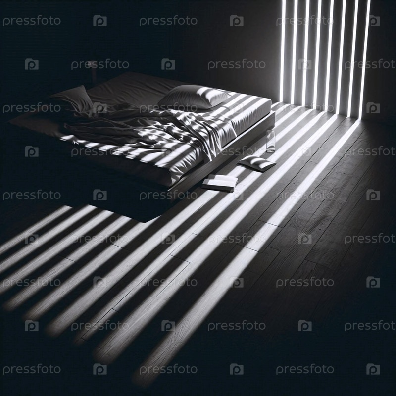 Абстрактный, высококонтрастный образец солнечного света, стекающего через венецианские жалюзи на скрученную кровать, Ай создал изображение
