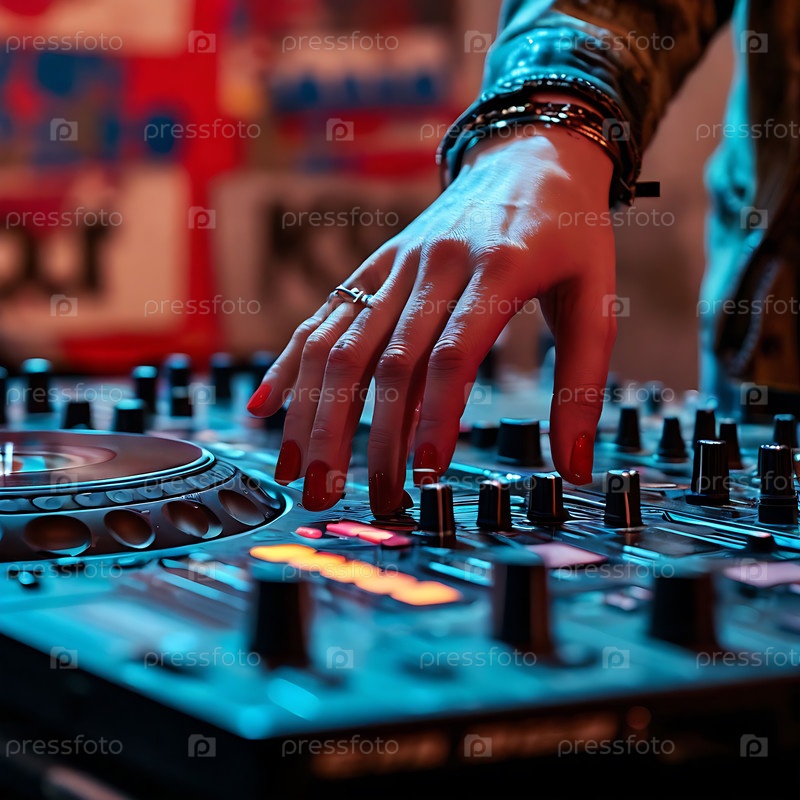 Руки диджея умело смешивают виниловые пластинки на проигрывателях в темном, освещенном неоном ночном клубе