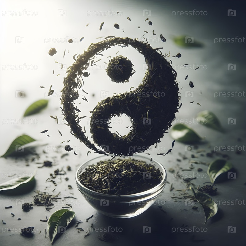 Плавучие чайные листья образуют символ инь-ян, Ai created image