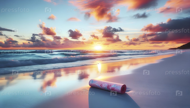 Одинокий йога-мат на белом песчаном пляже при закате, Ai created image