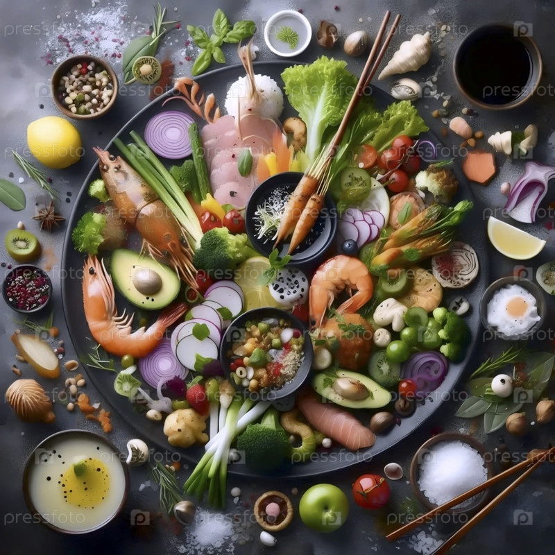 Культурное искусство пищевого синтеза, смешивающее ингредиенты и стили покрытия из разных кухонь мира, Ai created image
