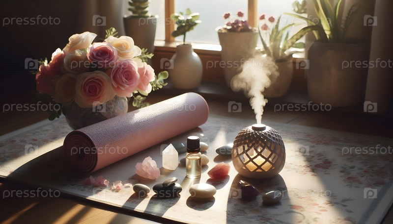 Матка для йоги с диффузором эфирного масла и кристаллическими камнями, Ai created image