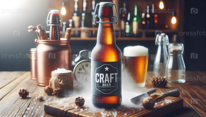 Крафт-бутылка пива, деревянный фон стола, изображение создано с помощью Ai