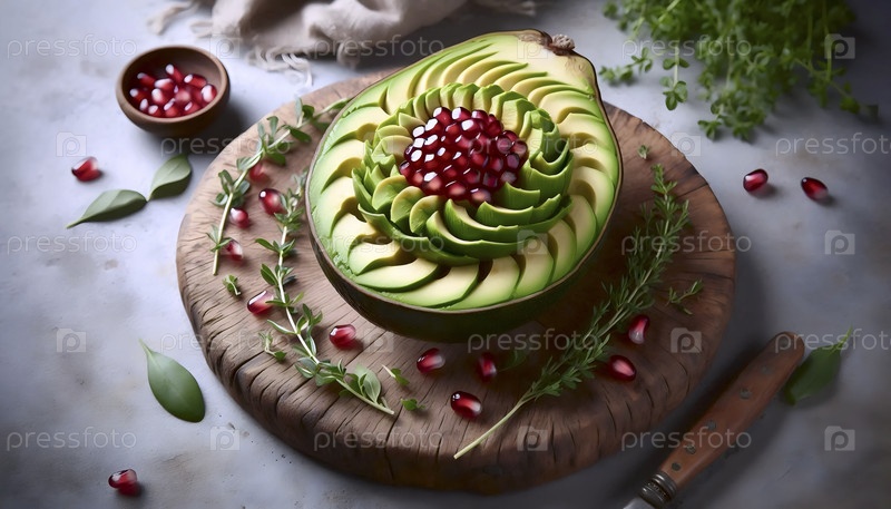 Авокадо, наполовину вырезанное в сложный цветочный дизайн с семенами граната как центром, Ai created image
