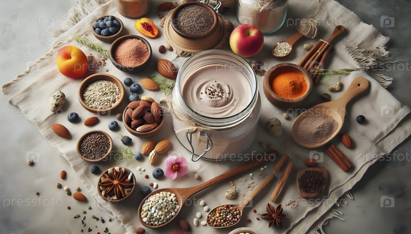 Бохо-стильный плоский слой с веганскими белковыми порошками в стеклянных банках, Ai created image