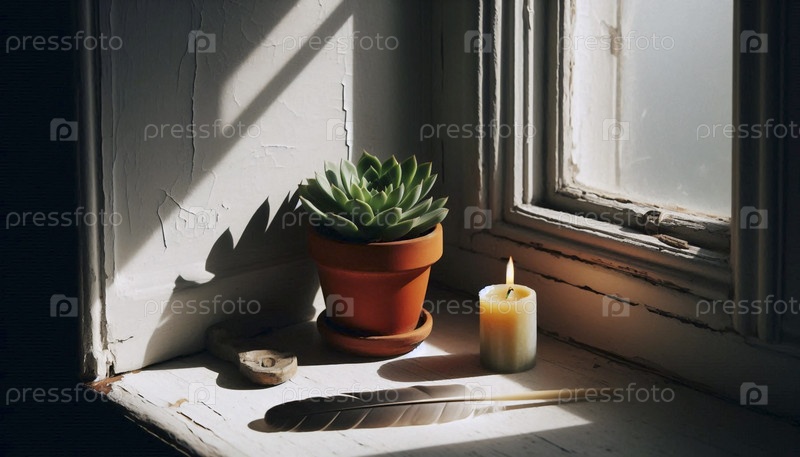 Алтарь на подоконнике со свечой и перьями, Ай создал изображение