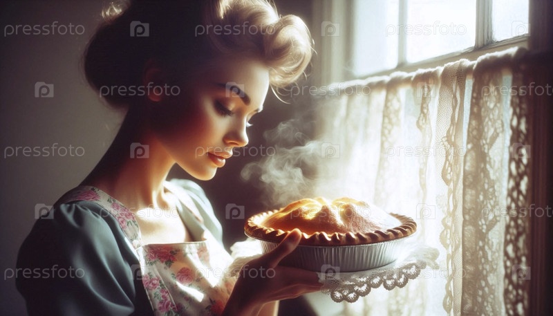 Портрет женщины на кухне, улыбающейся, когда она кладет вишневый пирог на подоконник для охлаждения, Ai generated image