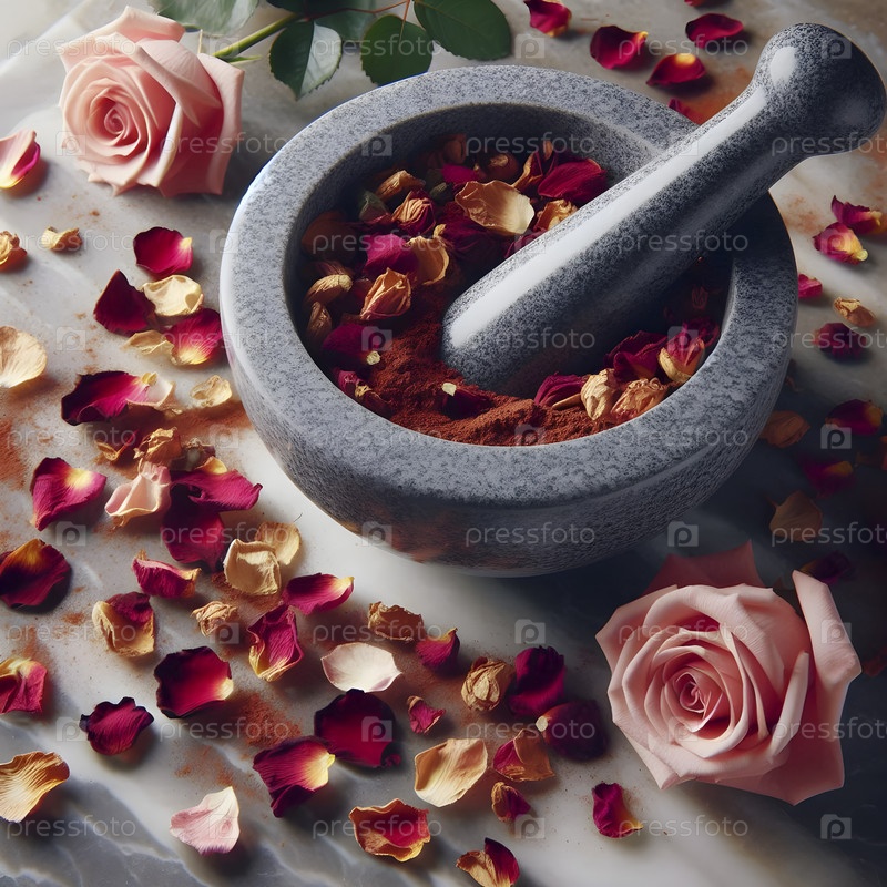 Молотком и пистолетом, измельчая сушеные листья роз в порошок, Ai created image
