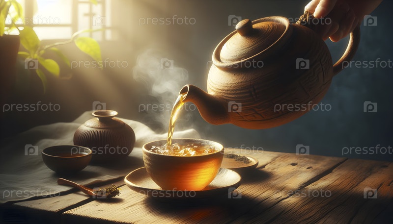 Рустичный глиняный чайник из Иксина, заливающий золотой оулонговый чай, Ai created image