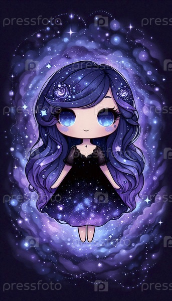 Подробная иллюстрация девушки-кавайи, которая является живым ночным небом, Ai generated image
