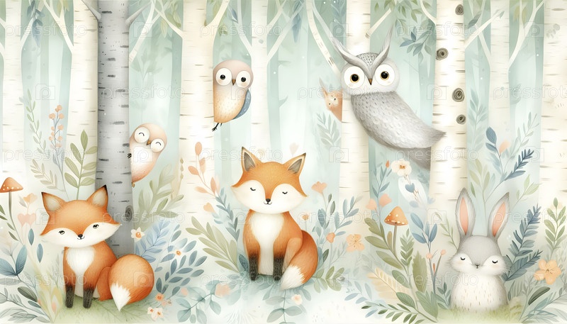 Причудливая акварель леса детская комната обои с дружелюбными животными - лисы, кролики и совы, Ai created image