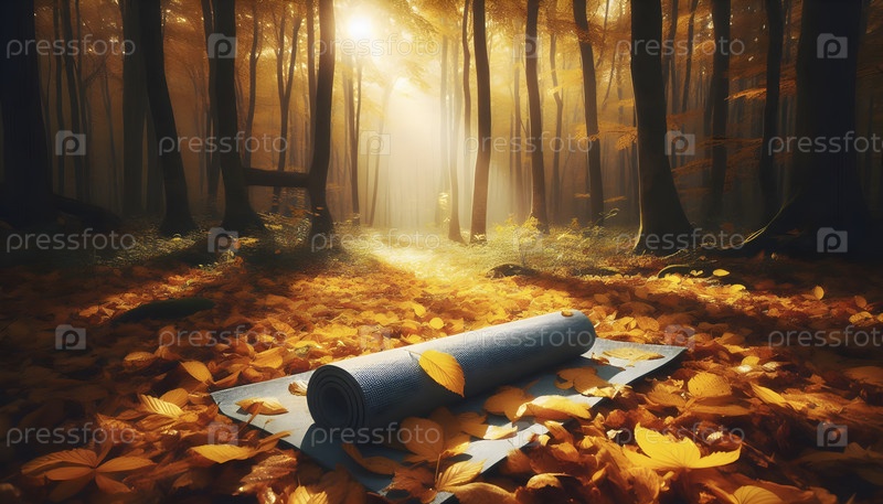 Заброшенный ковер для йоги в осеннем лесу, Ai created image
