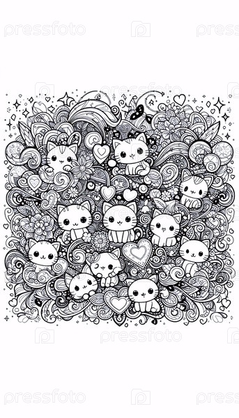 Красочная страница кавайи с волшебными кошками и вихрями, Ai generated image