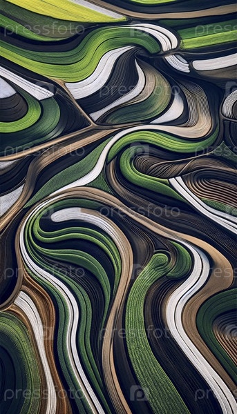 Вид с воздуха на плотное геометрическое сельскохозяйственное поле, образующее абстрактный рисунок линий и кривых, Ai generated image