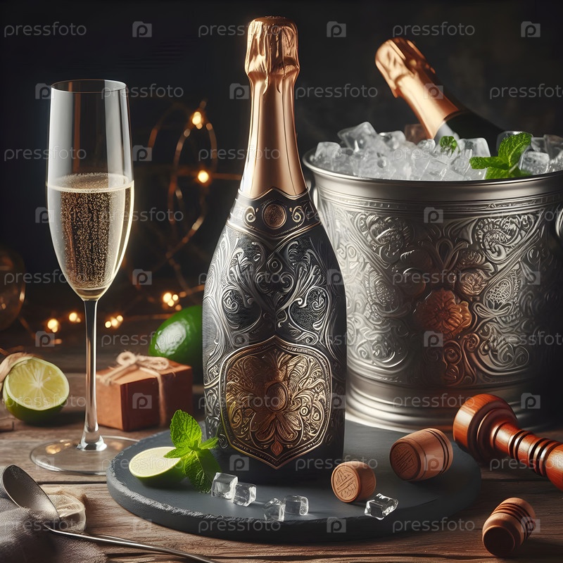 Бутылка шампанского с металлической этикеткой, изображение создано AI