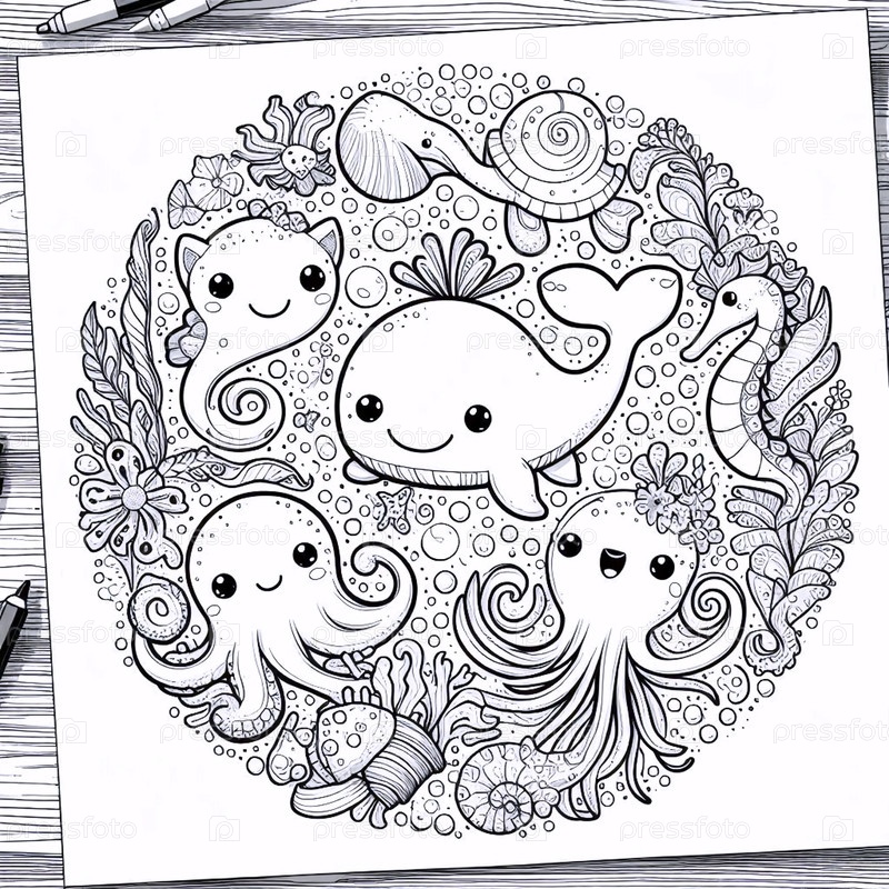 A kawaii ocean creatures цветная страница в круговом формате, Ai generated image