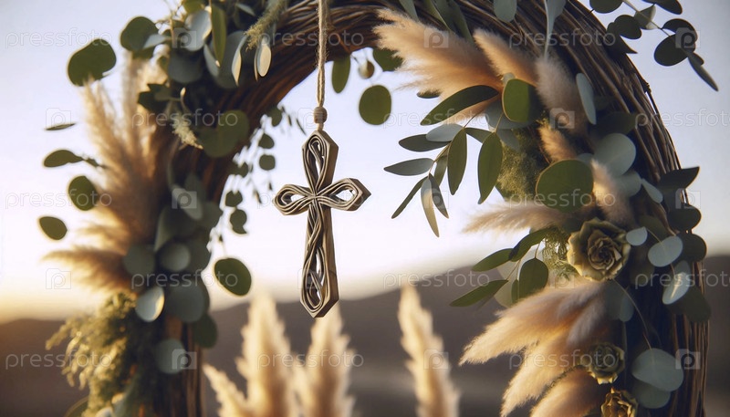 Декор свадебной елки с эвкалиптом, сушеными цветами и подвесным крестом, Ai generated image