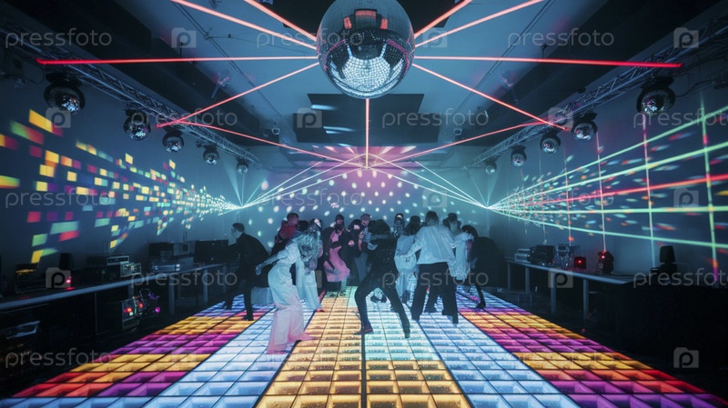 Сцена в ночном клубе с одним гигантским дискотечным шаром, отражающим красочные лазерные лучи во всех направлениях, Ai generated image