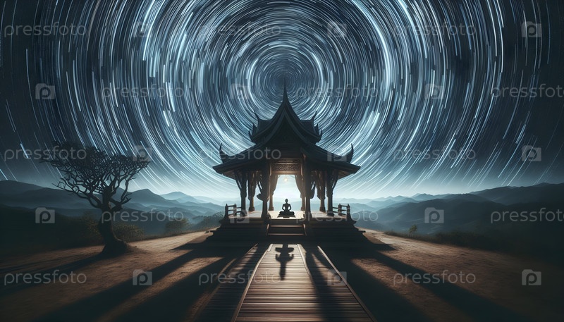 Time-lapse концепция звездных троп над пустынной платформой йоги, Ai created image