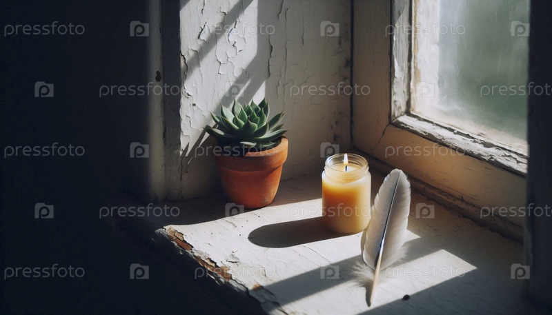 Алтарь на подоконнике со свечой и перьями, Ай создал изображение