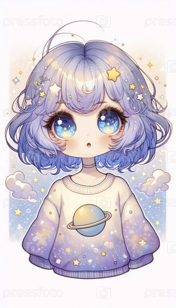 Подробная иллюстрация кавайской девочки со звездами в глазах, Ai generated image