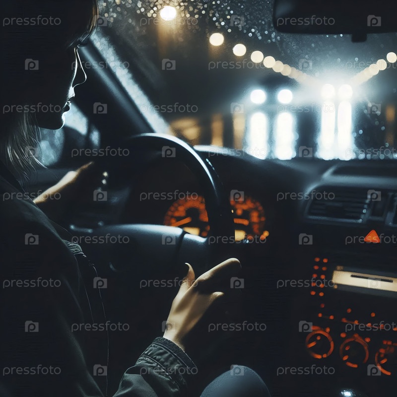 Кинографический кадр женской руки, опирающейся на рулевое колесо, ее лица в тени, наблюдая за дождевыми полосами по лобовому стеклу, Ай создал изображение