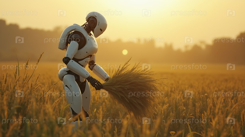 Роботизированный фермер, собирающий урожай в футуристическом поле, Ai generated image
