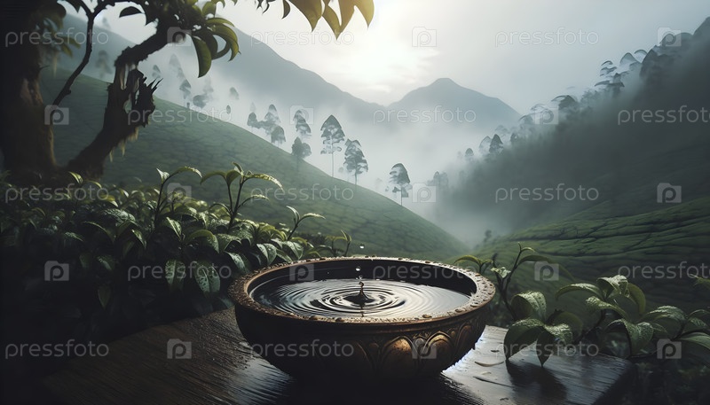 Дождевая вода, собранная в бронзовом сосуде, Ai created image