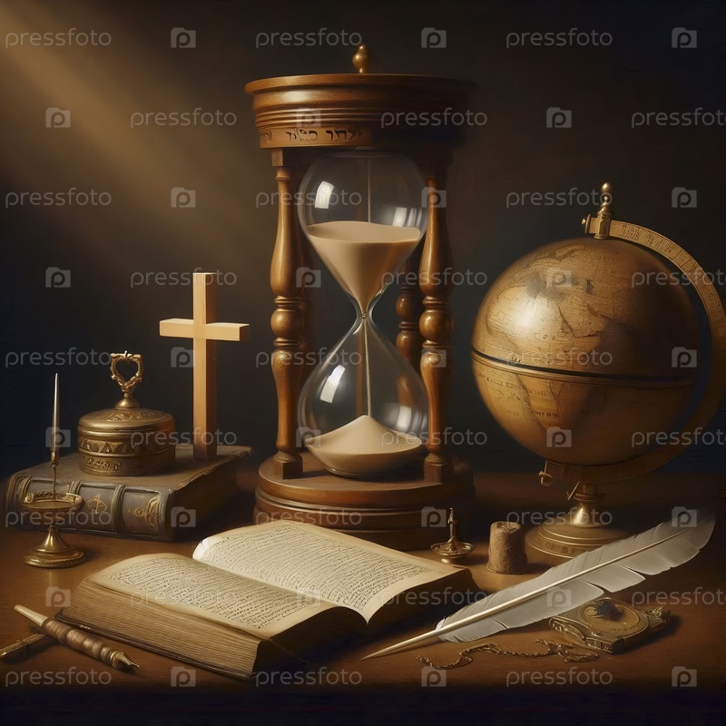 Натурм с песочными часами, крестом и открытой книгой Ai generated image