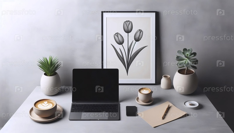 Искусство, ноутбук с чашкой кофе, Ai generated image Lat