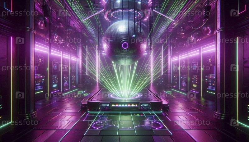 Сцена в ночном клубе с одним гигантским дискотечным шаром, отражающим красочные лазерные лучи во всех направлениях, Ai generated image