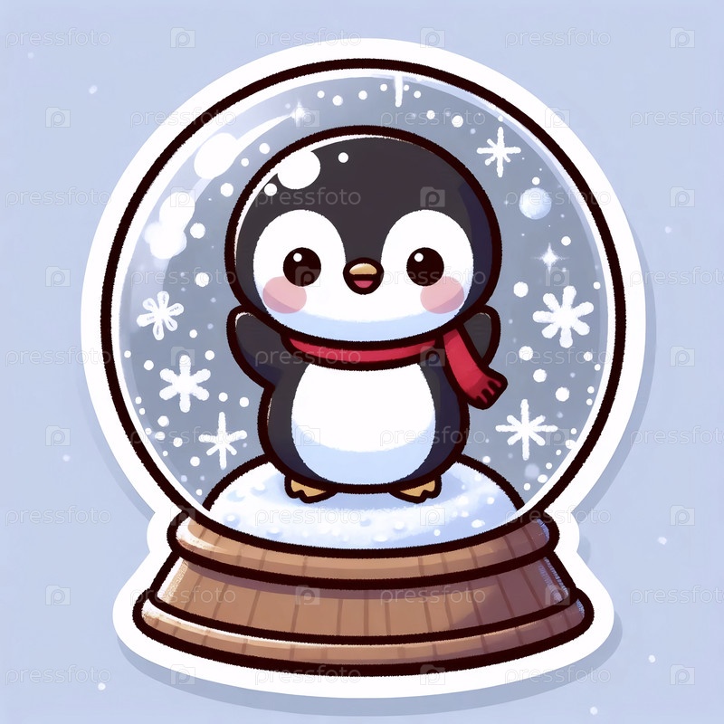 Милый стикер кавайи пингвин в снежном шаре, Ai generated image