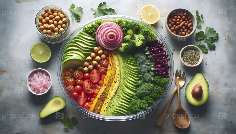 Стеклянная коробка для блюд со слойной чашей Будды: авокадо, горох и капуста, Ai created image