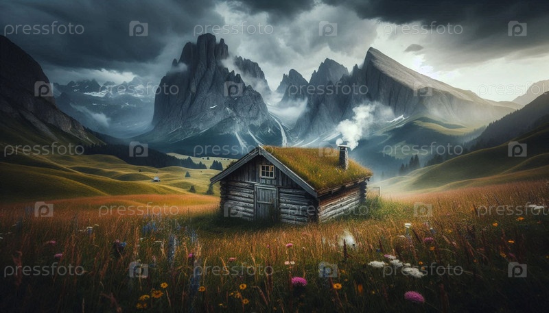 Обрушившийся пастырский домик на лугу, Ai generated image