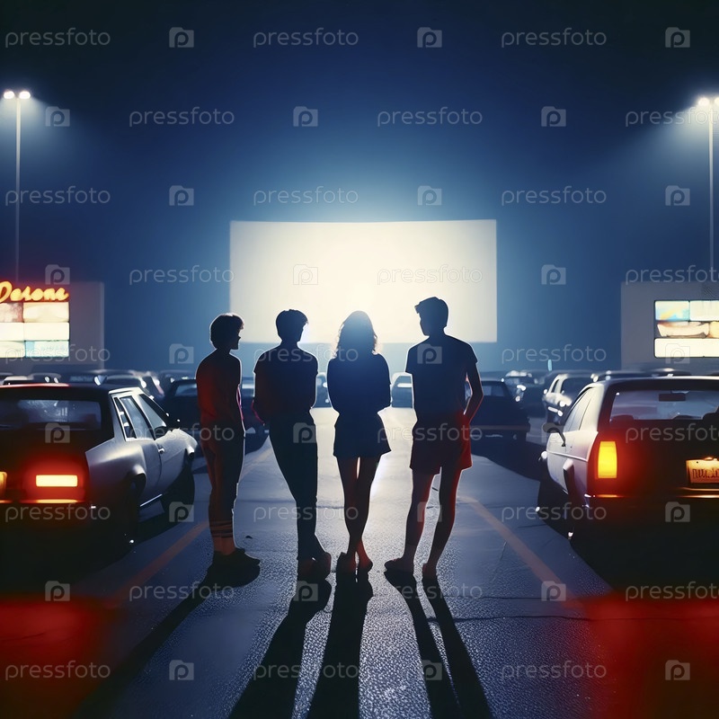 Группа друзей, сидящих на капоте автомобиля и слушающих музыку из бумбокса в драйв-ин-кинотеатре, Ai generated image