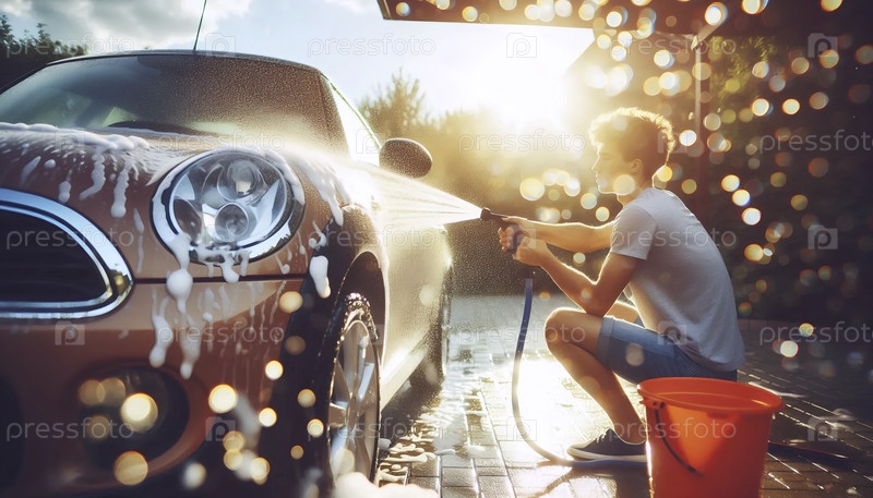 Подросток моет классический автомобиль в подъезде, вода и мыло сияют на солнце, Ai generated image