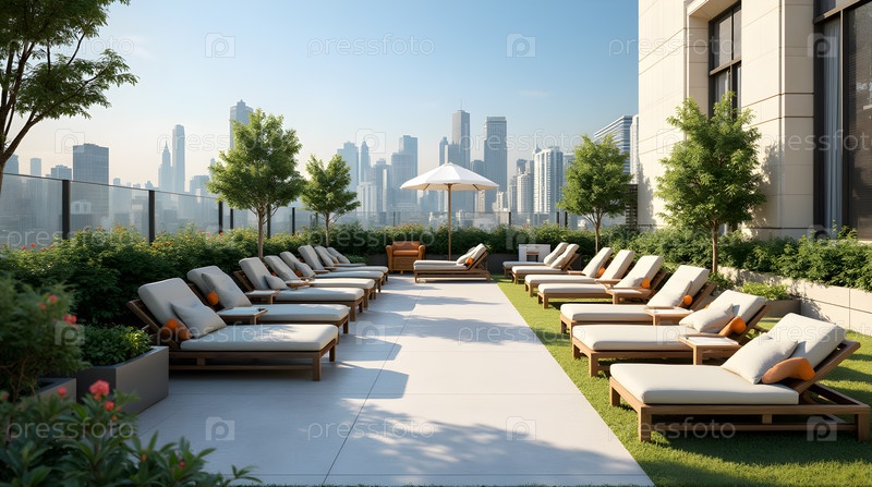 Сад на крыше с креслами, изображение создано с помощью Ai A rooftop garden with lounge chairs