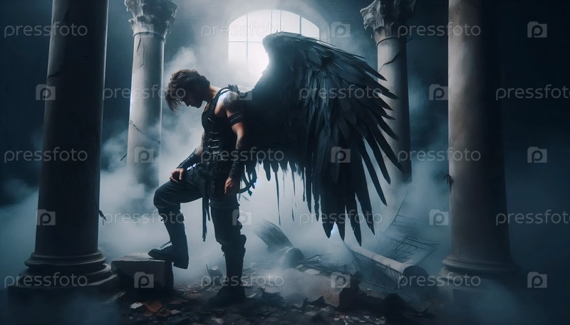 Темный готический ангел с разорванными крыльями в пост-апокалиптических руинах, Ai generated image