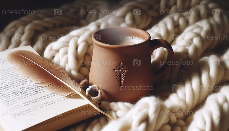 Уютная иллюстрация бохо из кипящей чаши на вязанном одеяле, Ai generated image