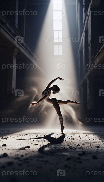 Танцовщица, практикующаяся одна в обширном пустом промышленном складе с дневным светом через разбитые окна, Ai generated image