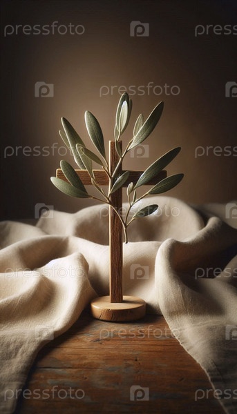 Минимальный крест из оливковых ветвей на льне, Ai generated image