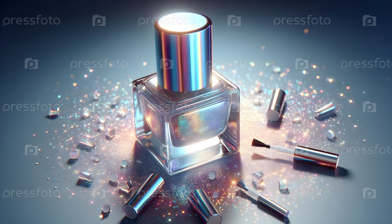 Бутылка с лаком для ногтей, плавающие частицы блеска, image created using Ai