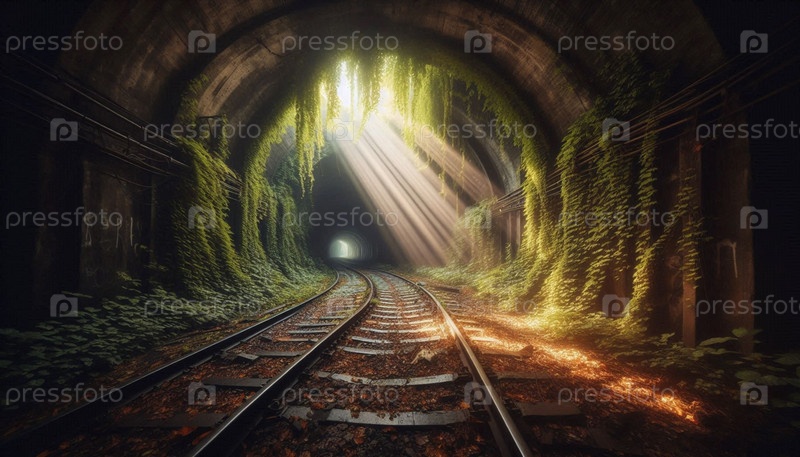 Заброшенный железнодорожный тоннель, покрытый плющом, Ai generated image