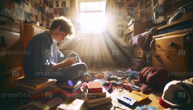 Подростковая беспорядочная спальня в 1980-х годах с плакатами группы на стене и стереоприемником, когда они играют на воздушной гитаре, Ай создала изображение